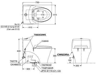 - Sản phẩm bao gồm: Thân cầu CW823RA, Bệ ngồi & nắp đậy TC393VS