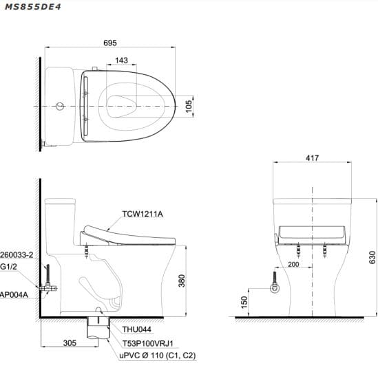 Bản vẽ Bàn Cầu TOTO 1 Khối MS855DE4 Nắp Cơ
