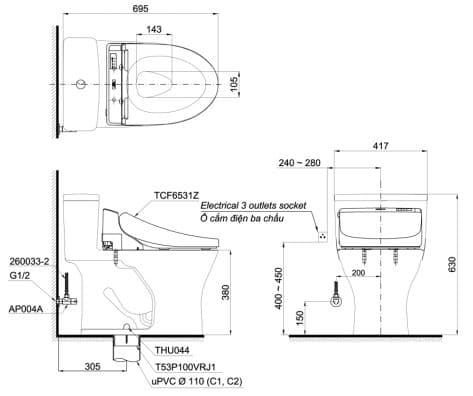 Bản vẽ lắp đặt Bàn Cầu TOTO 1 Khối MS855DW6 Nắp Điện Tử