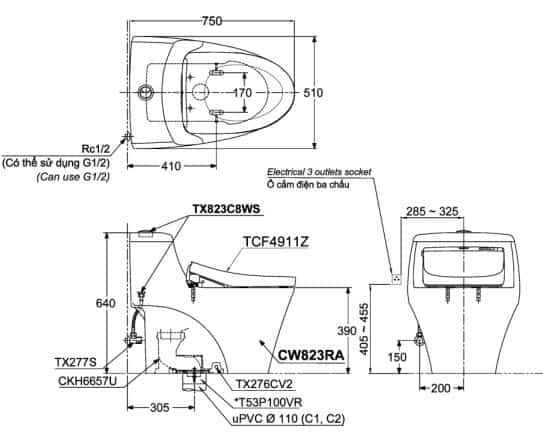 Bản vẽ Bồn Cầu TOTO 1 Khối CW823RAW11 Nắp Điện Tử