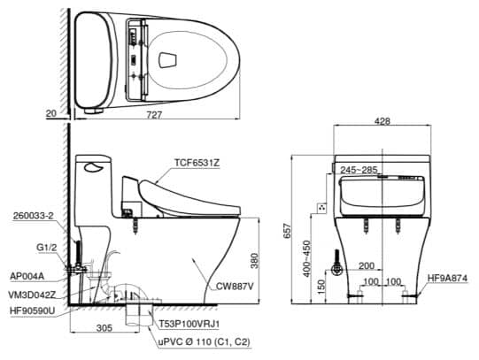 Bản vẽ lắp đặt Bồn Cầu TOTO 1 Khối MS887W6 (MS887RW6) Nắp Điện Tử