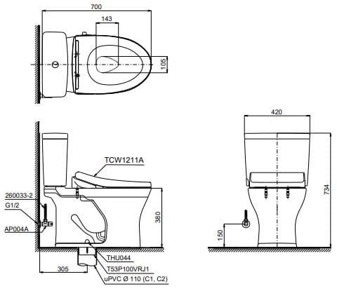 - Thân cầu: C735, Két nước S735D, Bệ ngồi & nắp đậy TCW1211A