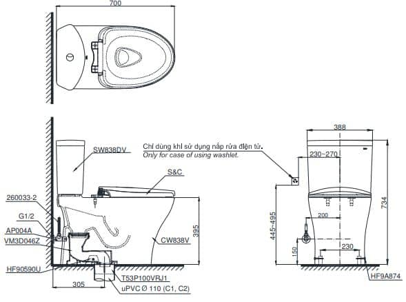 Bồn Cầu TOTO 2 Khối CS838DE2 Nắp Cơ