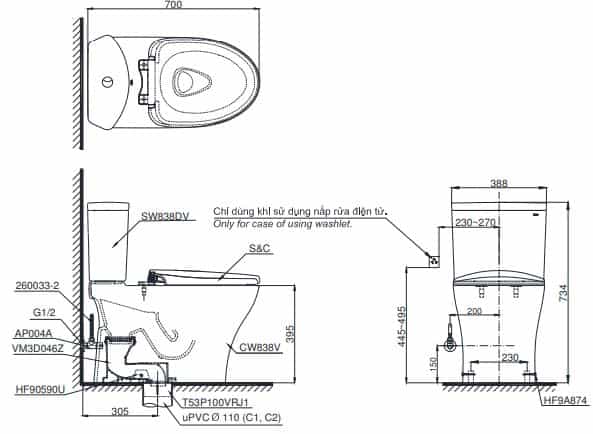 Bản vẽ lắp đặt Bồn Cầu TOTO 2 Khối CS838DW11 Nắp Điện Tử