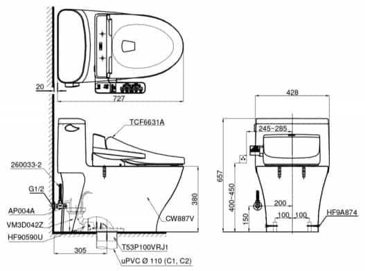 Bản vẽ lắp đặt Bồn Cầu TOTO 1 Khối MS887W7 Nắp Điện Tử