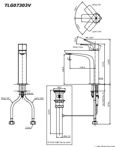 Bản vẽ lắp đặt Vòi Lavabo TOTO TLG07303V Nóng Lạnh