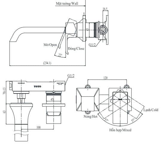 Bản vẽ Vòi Lavabo TOTO TLG08308B Nóng Lạnh Gắn Tường