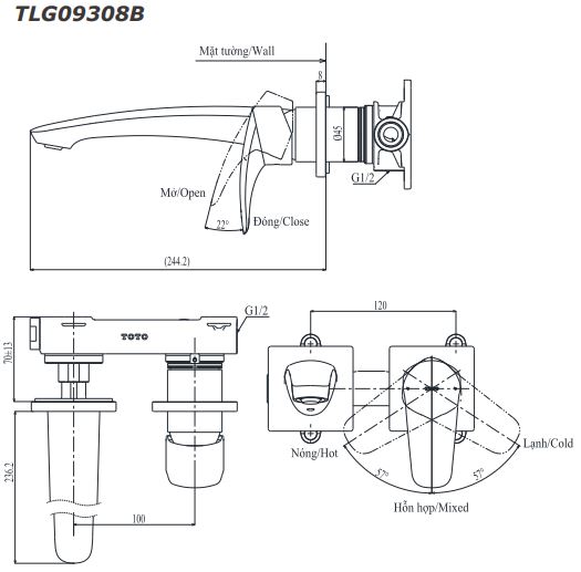 Bản vẽ Vòi Lavabo TOTO TLG09308B Nóng Lạnh Gắn Tường